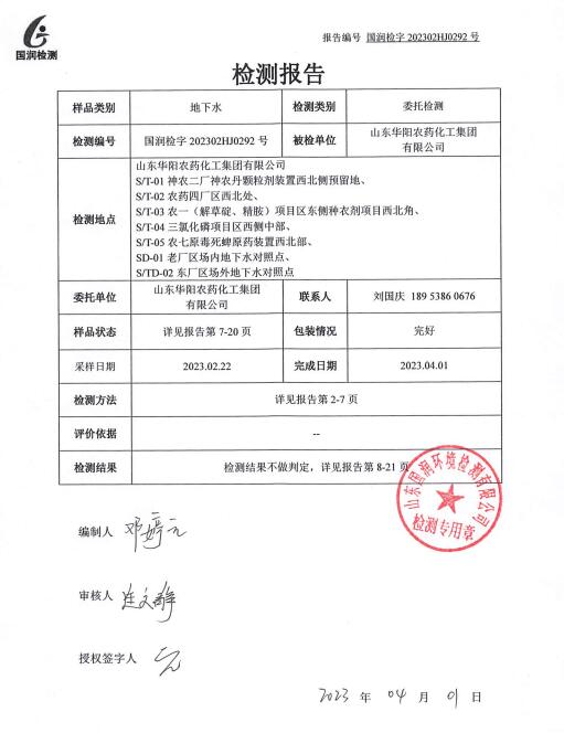 公司動態(tài) 首頁 > 華陽新聞 > 公司動態(tài) > 列表 山東華陽農(nóng)藥化工集團(tuán)有限公司地下水檢測報告 附件:山東華陽農(nóng)藥化工集團(tuán)有限公司地下水檢測報告.pdf